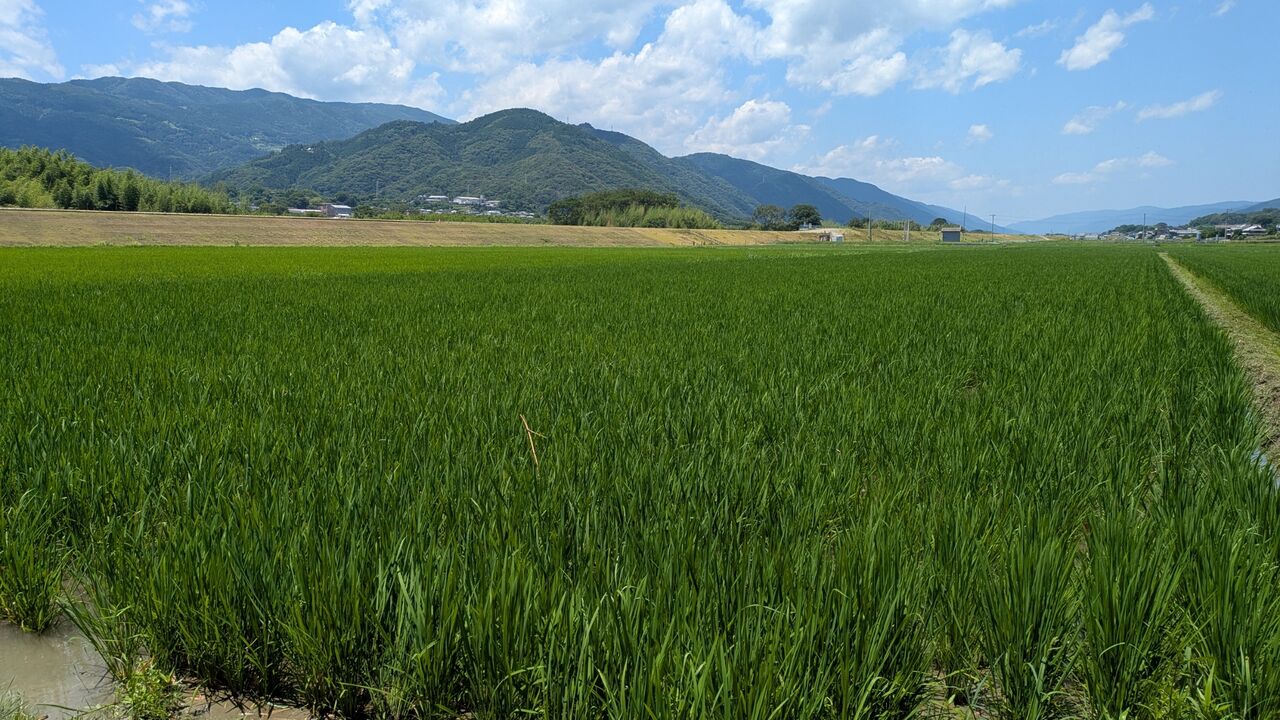 前回の石灰散布後、特に問題なく育っております。それどころか、石灰撒いた手前の田んぼのほうが、撒いてない奥の田んぼより色も勢いも良いのは気のせいでしょうか?